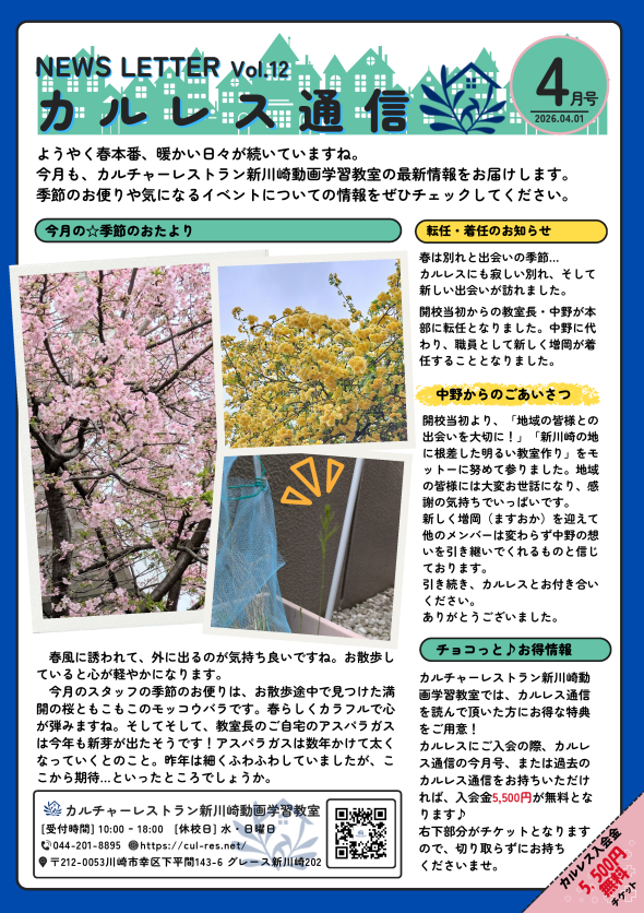 桜の盛りが短くて寂しいですが、今月のカルレス通信をお届けします。